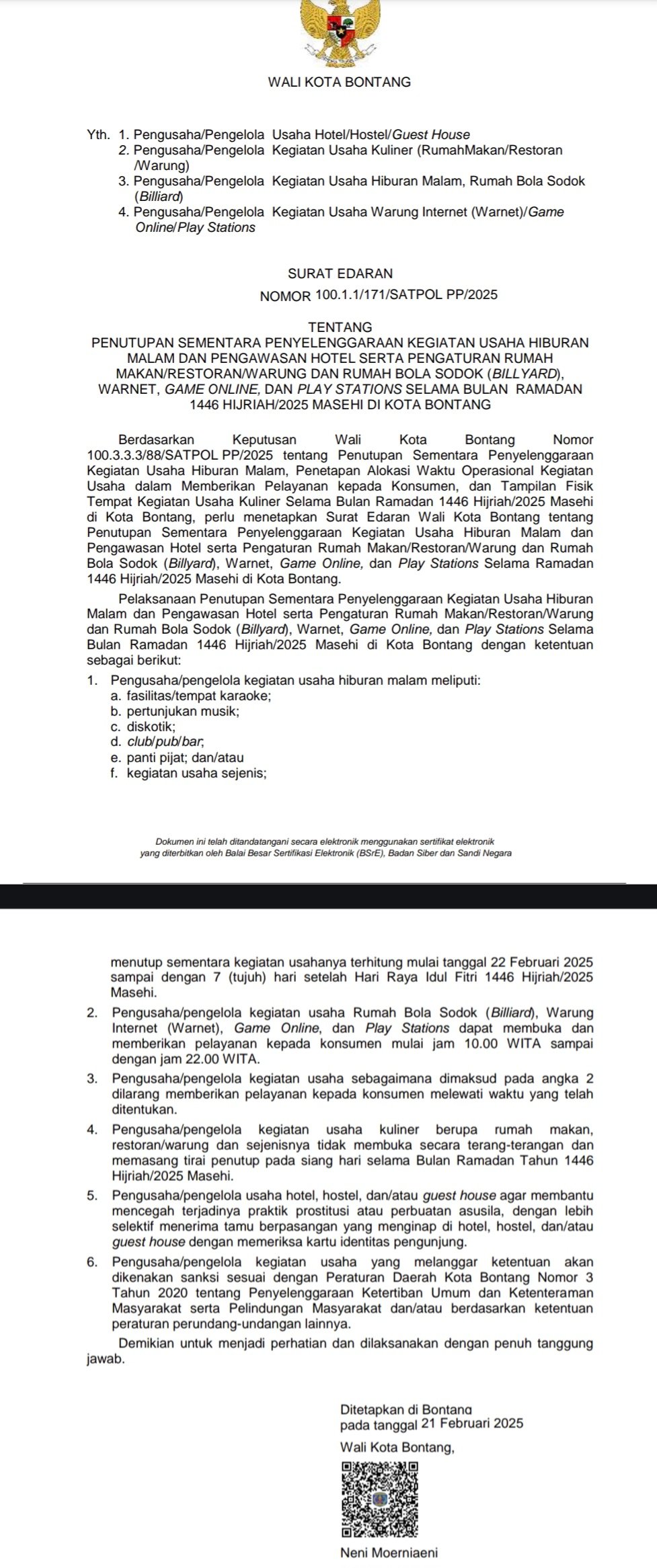 Surat edaran tersebut, Nomor 100.1.1/171/SATPOL PP/2025, menegaskan bahwa semua kegiatan usaha hiburan malam, termasuk tempat karaoke, pertunjukan musik.