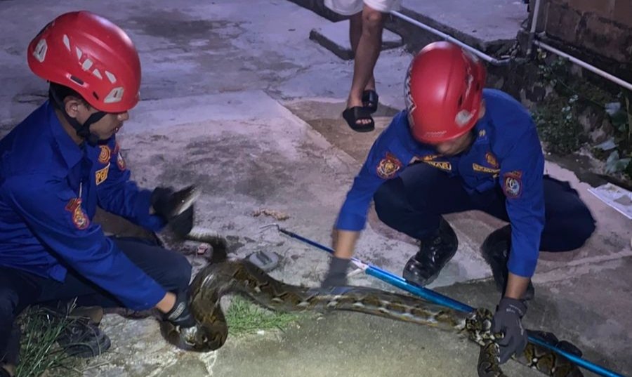 Petugas Damkar yang ikut evakuasi, Ryan Muhamad mengatakan, saat tim tiba di lokasi, ular sepanjang sekitar 5 meter dan berjenis piton atau sanca kembang ditemukan berada di depan rumah warga dan berhasil ditangkap.